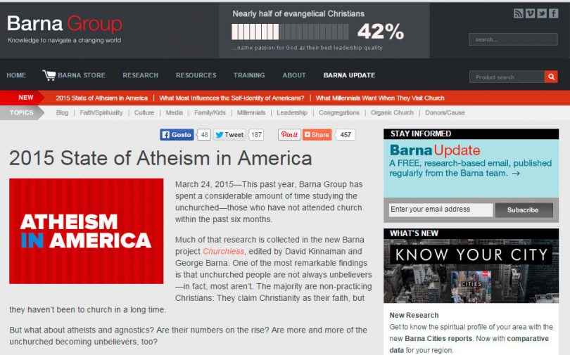 Segundo relatório recém-lançado pelo Instituto Barna sobre ceticismo religioso, 25% de todos os americanos adultos que não frequentam a igreja são considerados ateus ou agnósticos.
