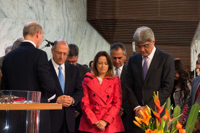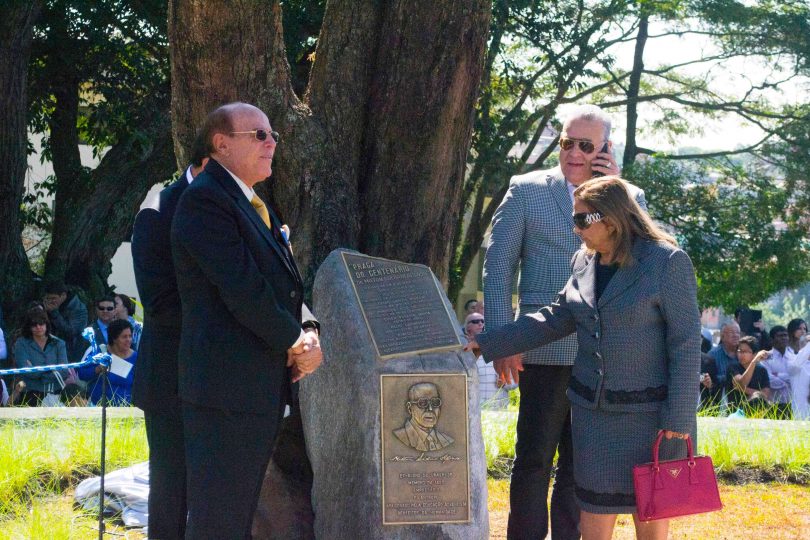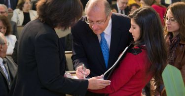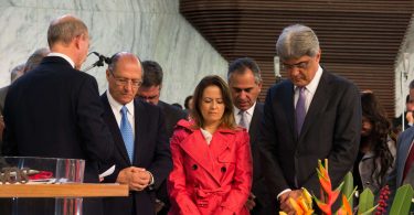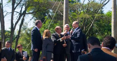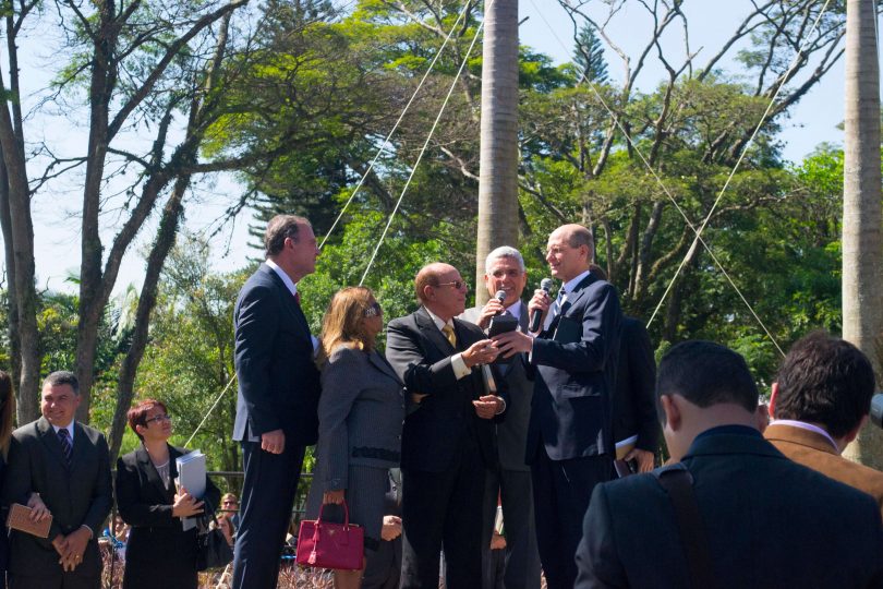 O pastor Helio Carnassale, diretor-geral do Unasp, campus SP, e o presidente mundial da Igreja Adventista, pastor Ted Wilson, presenteiam o governador de São Paulo com o “Marco do Centenário”. Foto: Márcio Tonetti