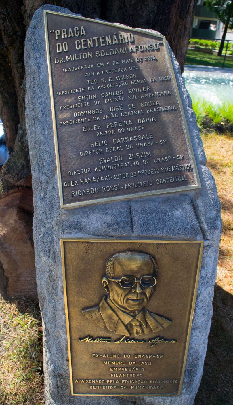 O ex-aluno, que veio prestigiar o culto de gratidão pelos cem anos, foi homenageado pela instituição com a inauguração de uma praça que leva o nome dele e o identifica como “apaixonado pela educação adventista” e “benfeitor da humanidade”. Localizada na parte central do campus São Paulo, em frente ao templo, a “Praça do Centenário Dr. Milton Soldani Afonso” será um ponto de encontro com a filosofia adventista. Cada detalhe da estrutura aponta para Jesus, o “mestre dos mestres”, e para ensinamentos bíblicos fundamentais (a exemplo do sábado como memorial da criação), o que reforça a mensagem de que o Unasp entra em uma nova fase de sua trajetória orientado pelos mesmos princípios que o conduziram até aqui. [Reportagem e fotos: Márcio Tonetti Tonetti, equipe RA]